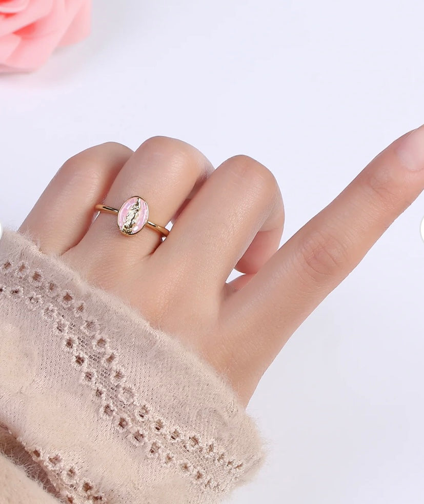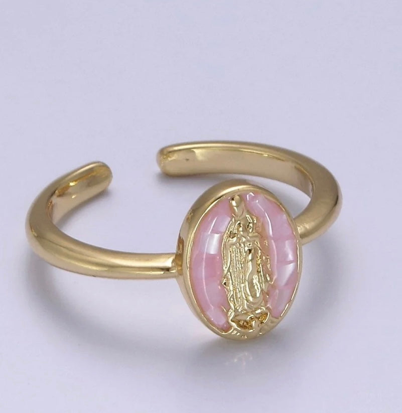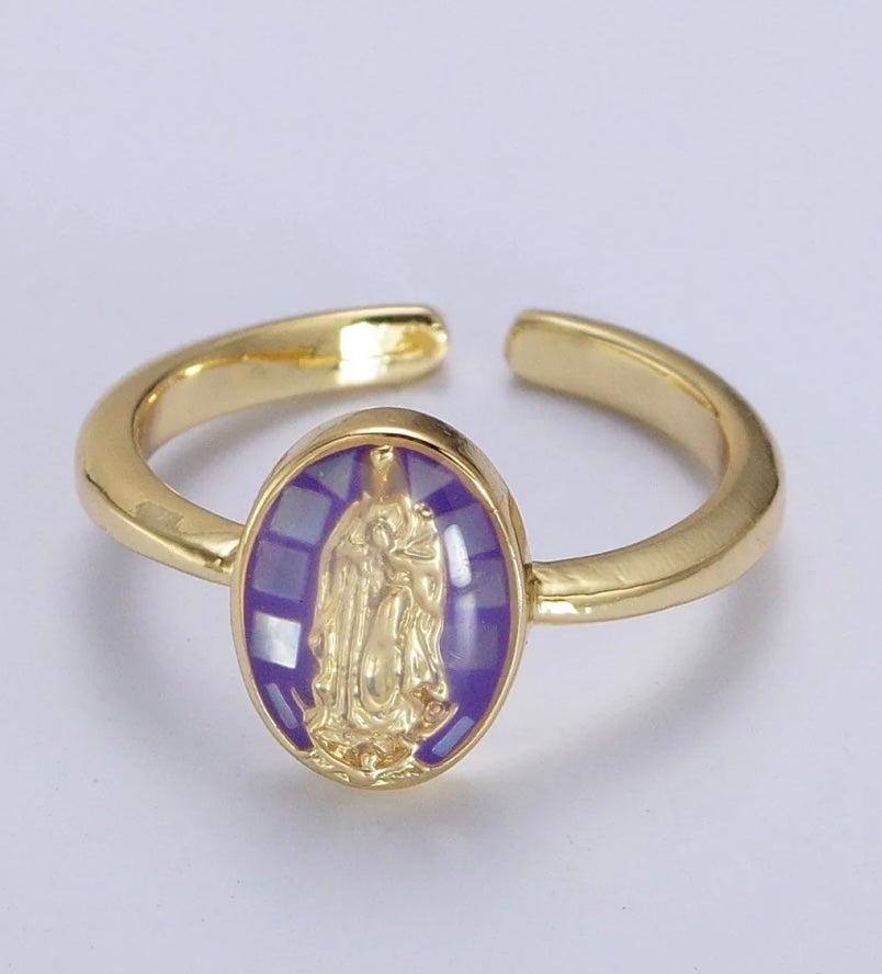 The Blessed Mary Ring is a sweet addition to our Coastal Ring Collection. Featuring Virgin Mary in gold against a blue, light pink, purple, and white shell. Adjustable to sizes 5-7