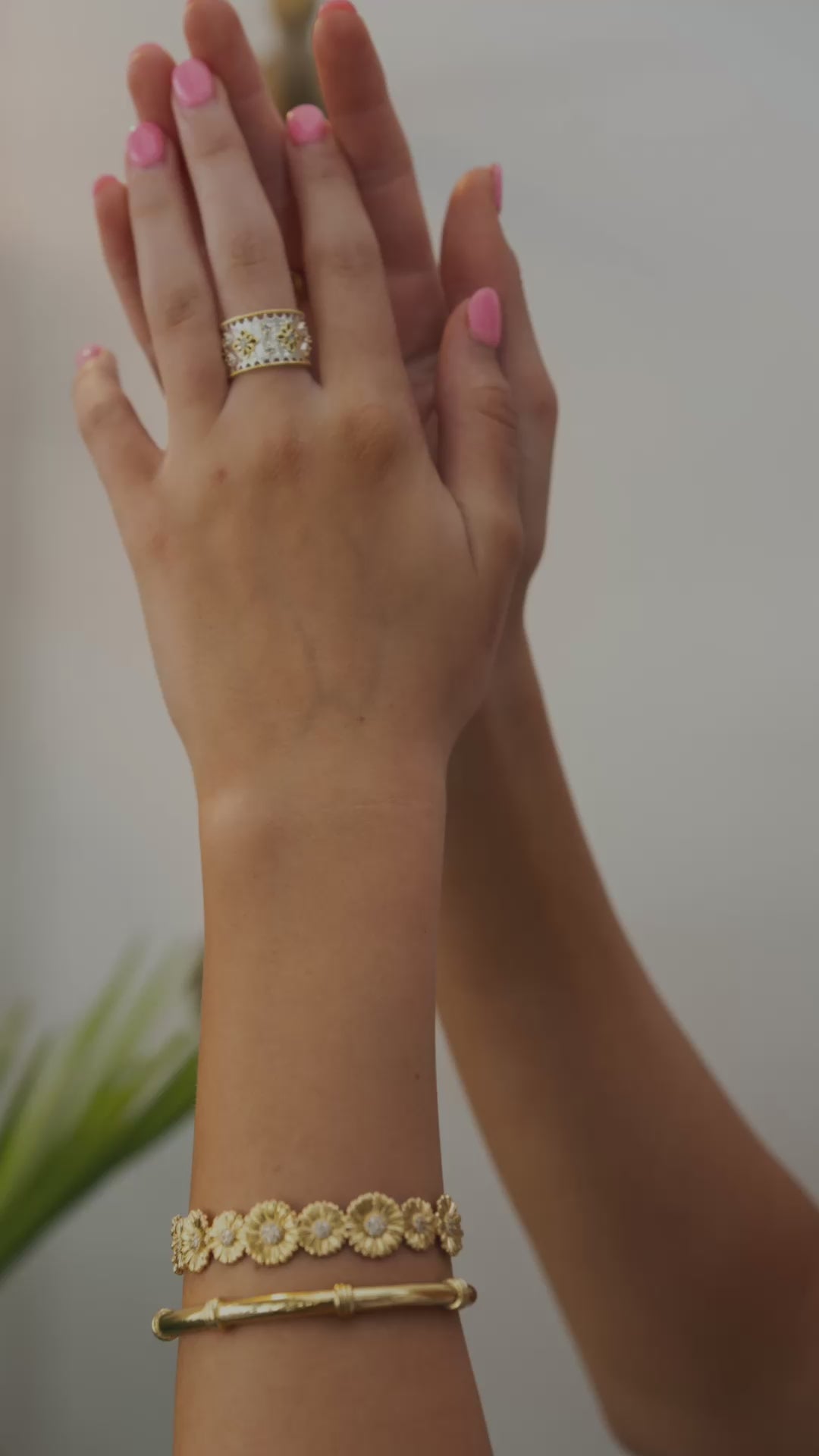 Beautiful vintage style gold and silver bands make up this exquisite collection. Open design to fit sizes 5-7
