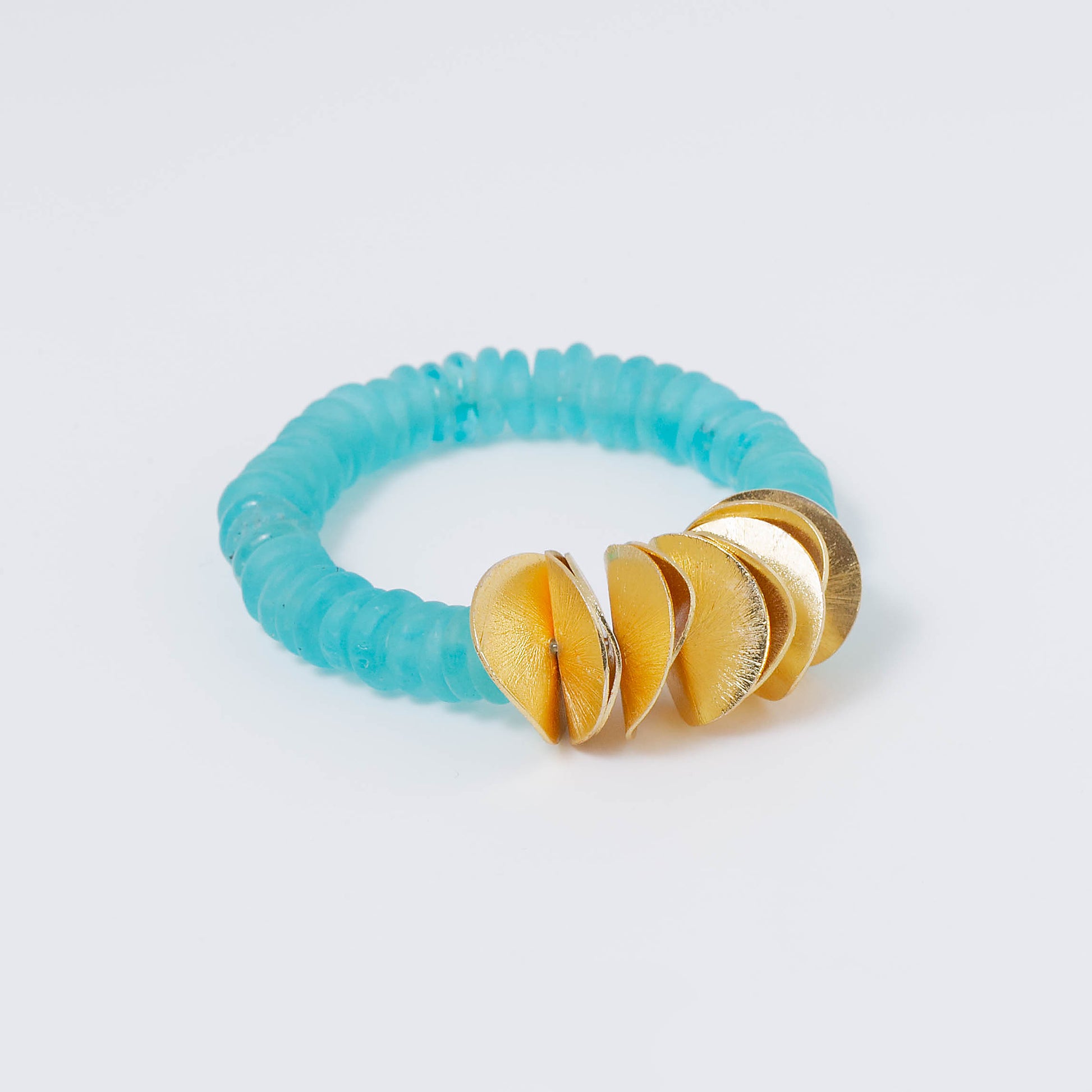 Beautiful aqua recycled glass beads globally sourced from Africa with gold filled accents. The imperfectly perfect look of these stunning beads will manifest adventure and beauty into your life! Pair with the Capri Sunset and Gold Horn Bracelet to create a stunning stack!