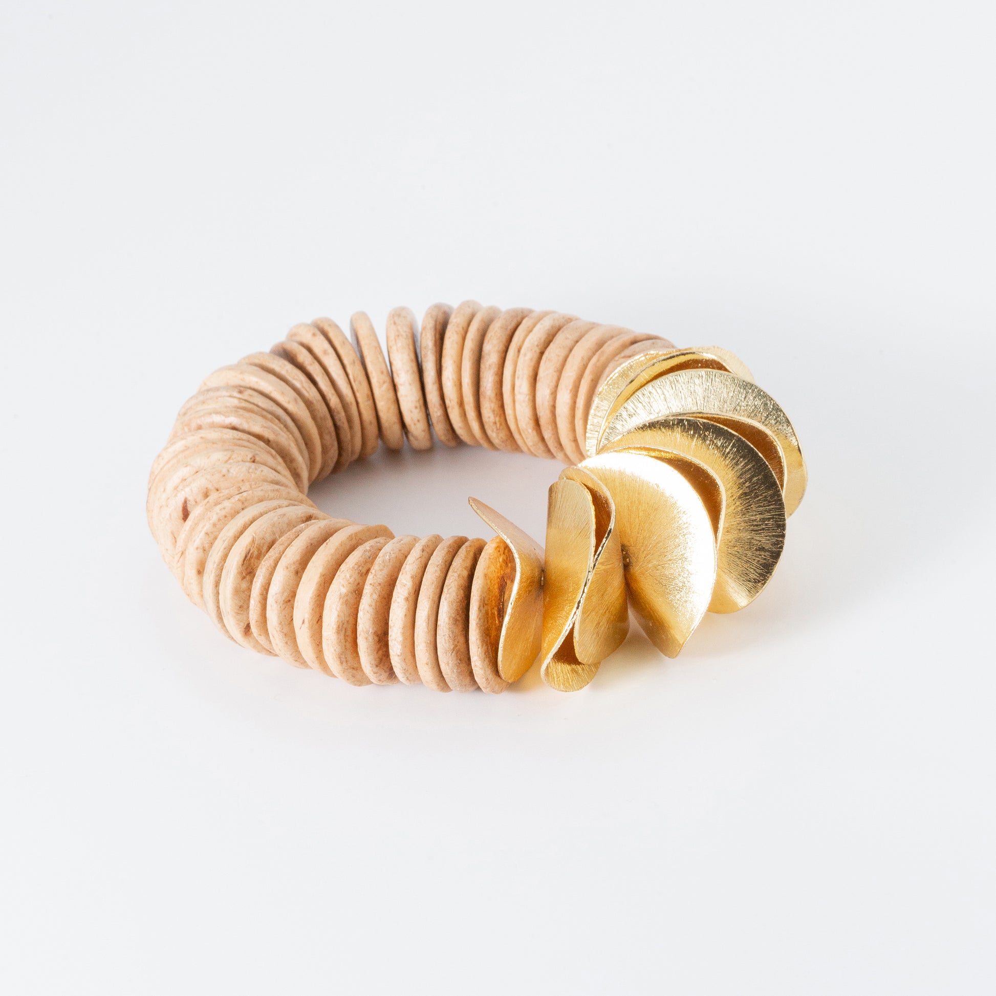 Our Cote d'Ivorie Collection is enviably chic, and impeccably luxurious. These beautiful hand-carved coconut wood beads and bold, gold discs create a statement piece with endless possibilities. From a chic resort look to an elegant, evening dinner, let your wild imagination of individual style echo! Create a dramatic combo when paired with the Gold Horn Bracelet!