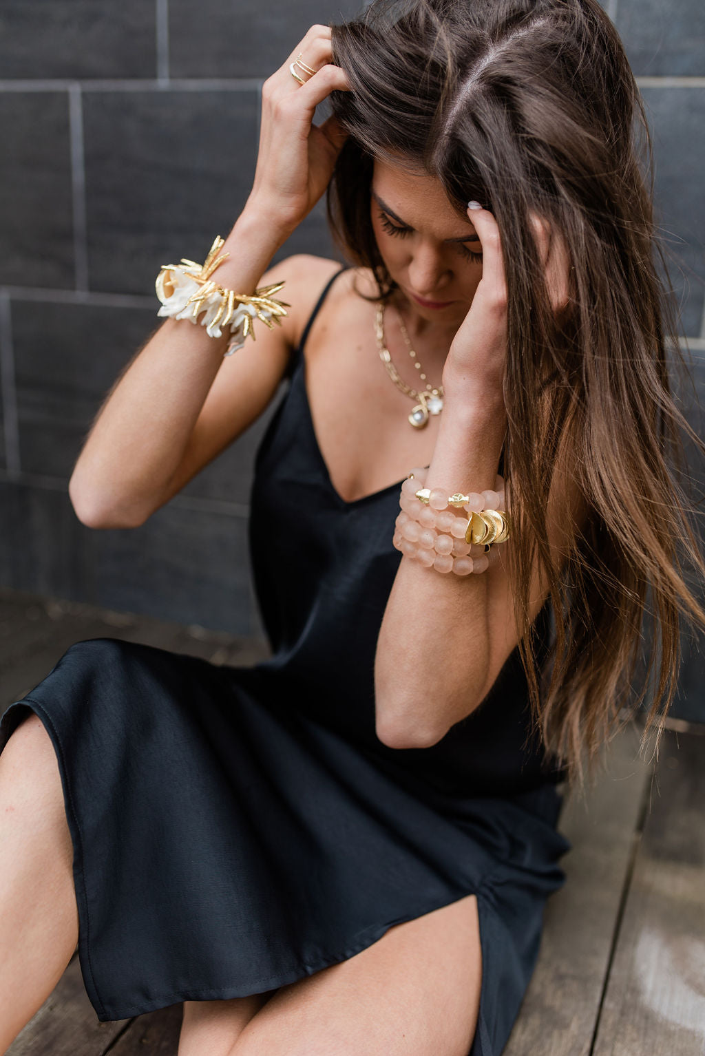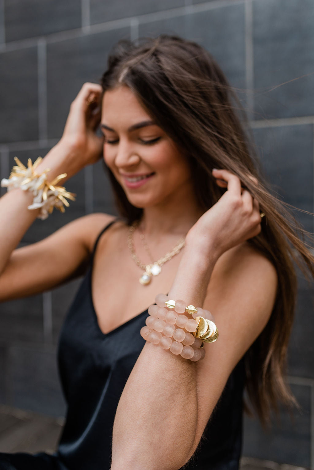 Our Cote d'Ivorie Collection is enviably chic, and impeccably luxurious. These beautiful white coral beads and bold, gold discs create a statement piece with endless possibilities. From a chic resort look to an elegant, evening dinner, let your wild imagination of individual style echo! Create a dramatic combo when paired with the Gold Horn Bracelet!