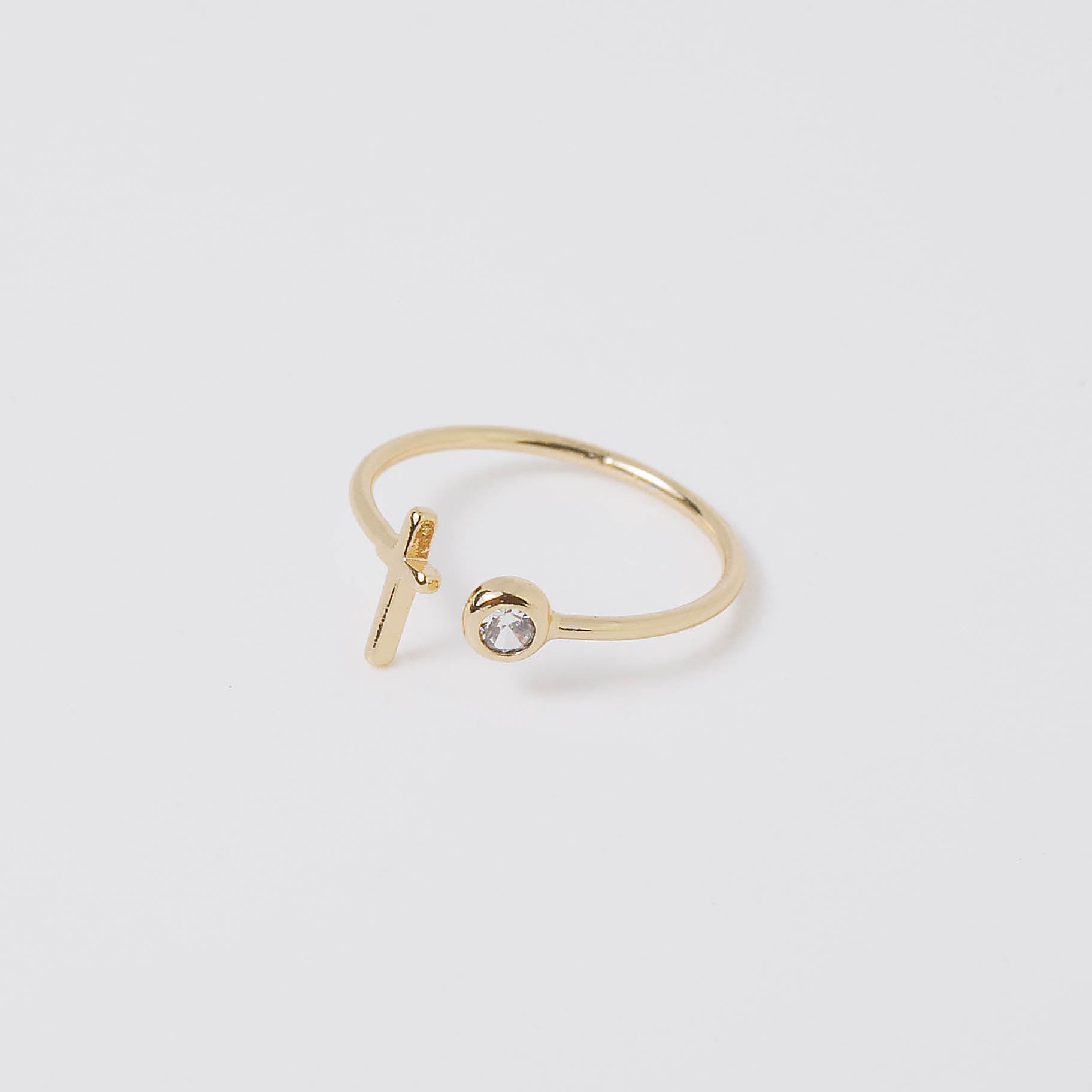 This dainty cross and stone ring is simple yet elegant. The open design of the gold band is perfect for stacking. Great gift for confirmation or graduation.