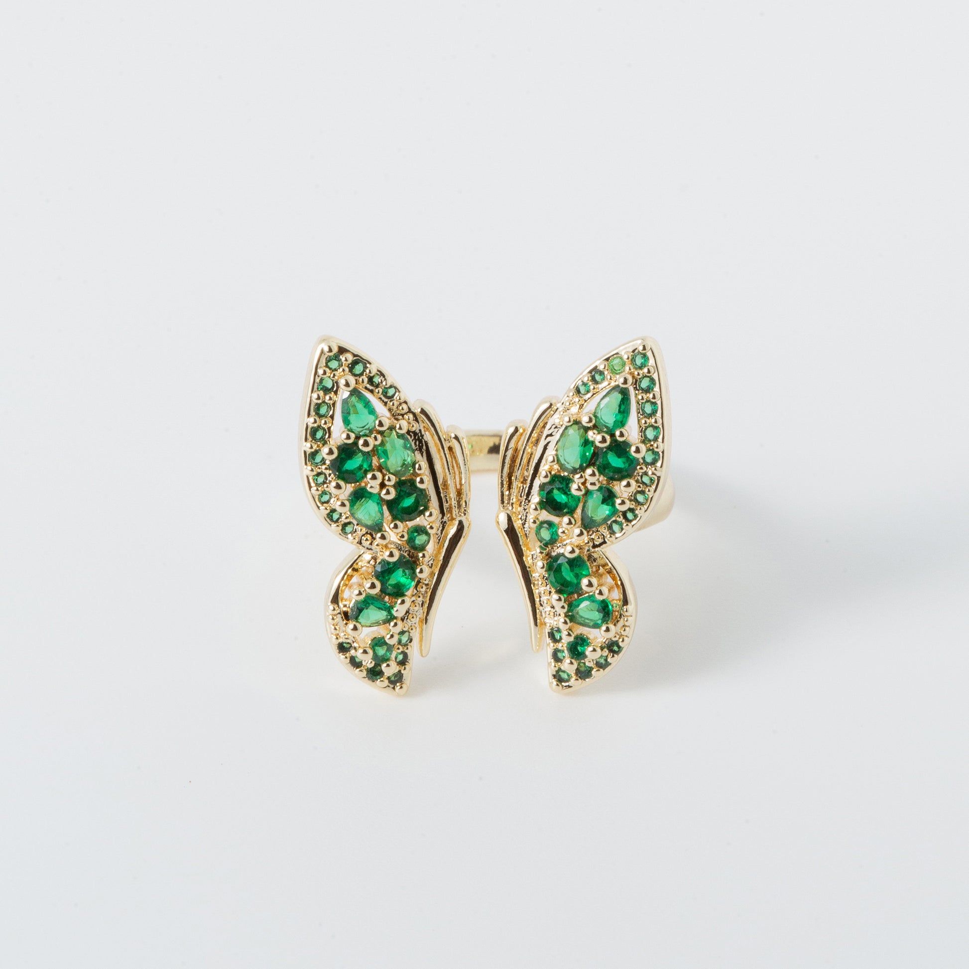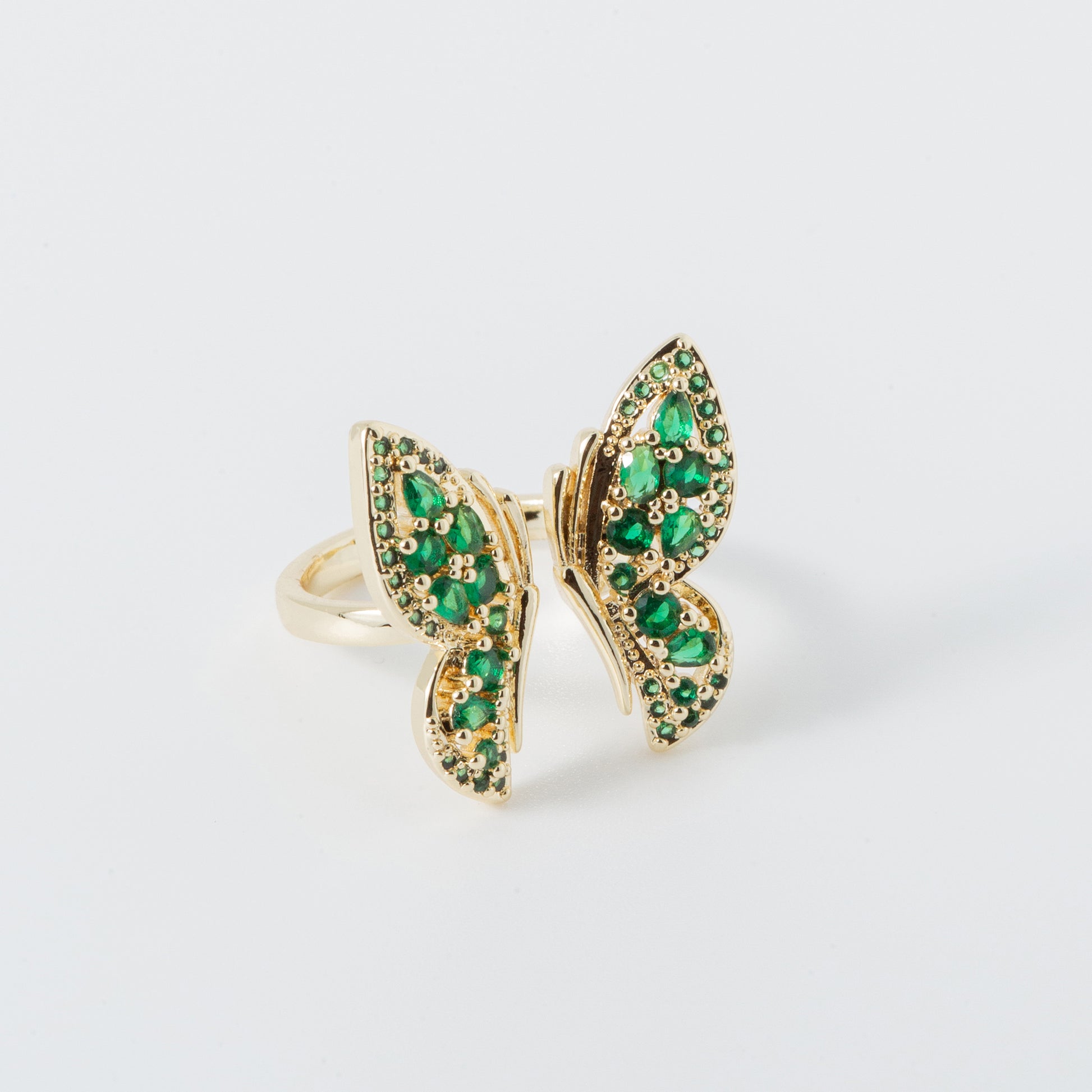 Beautiful eye-catching emerald stone monarch butterfly ring with an open design.