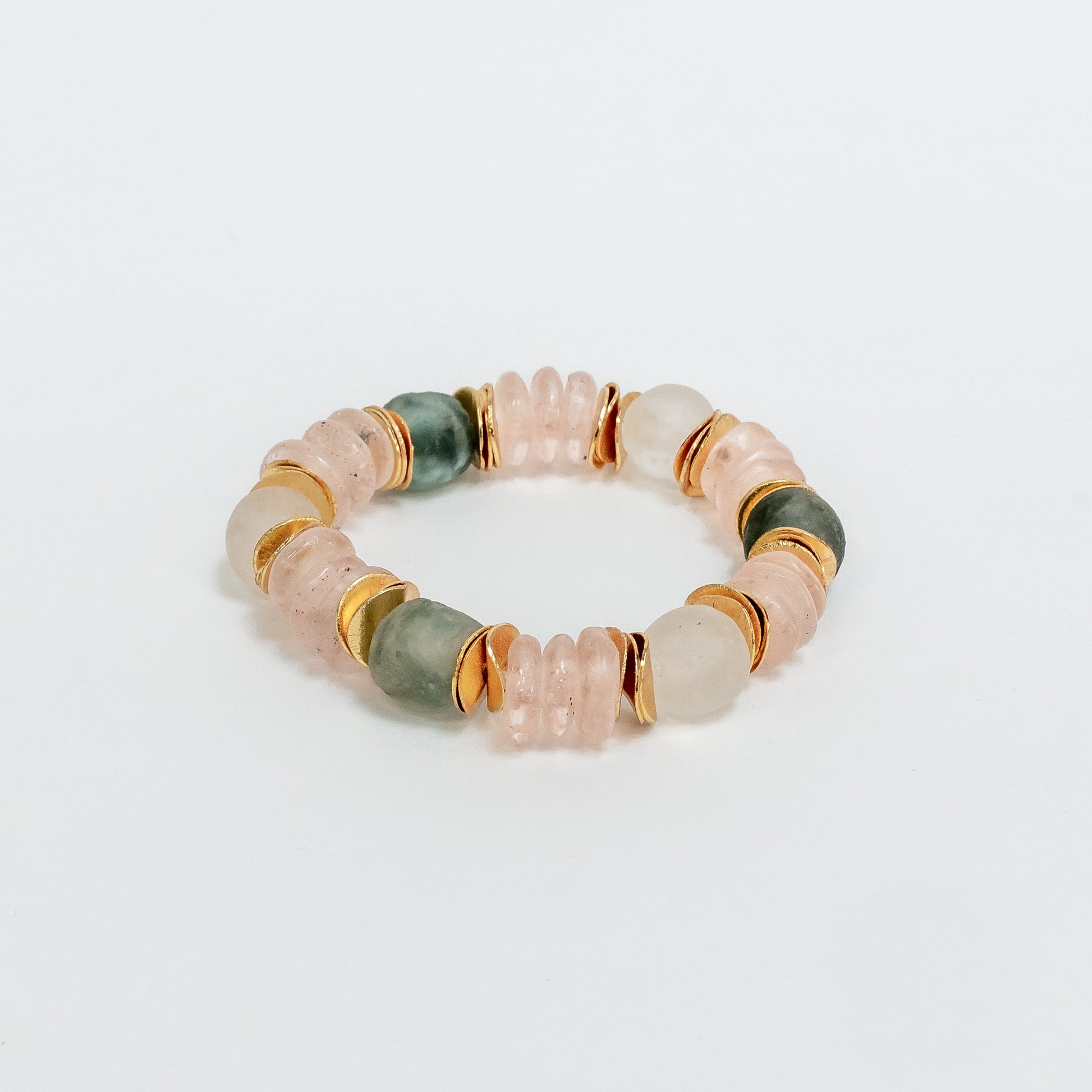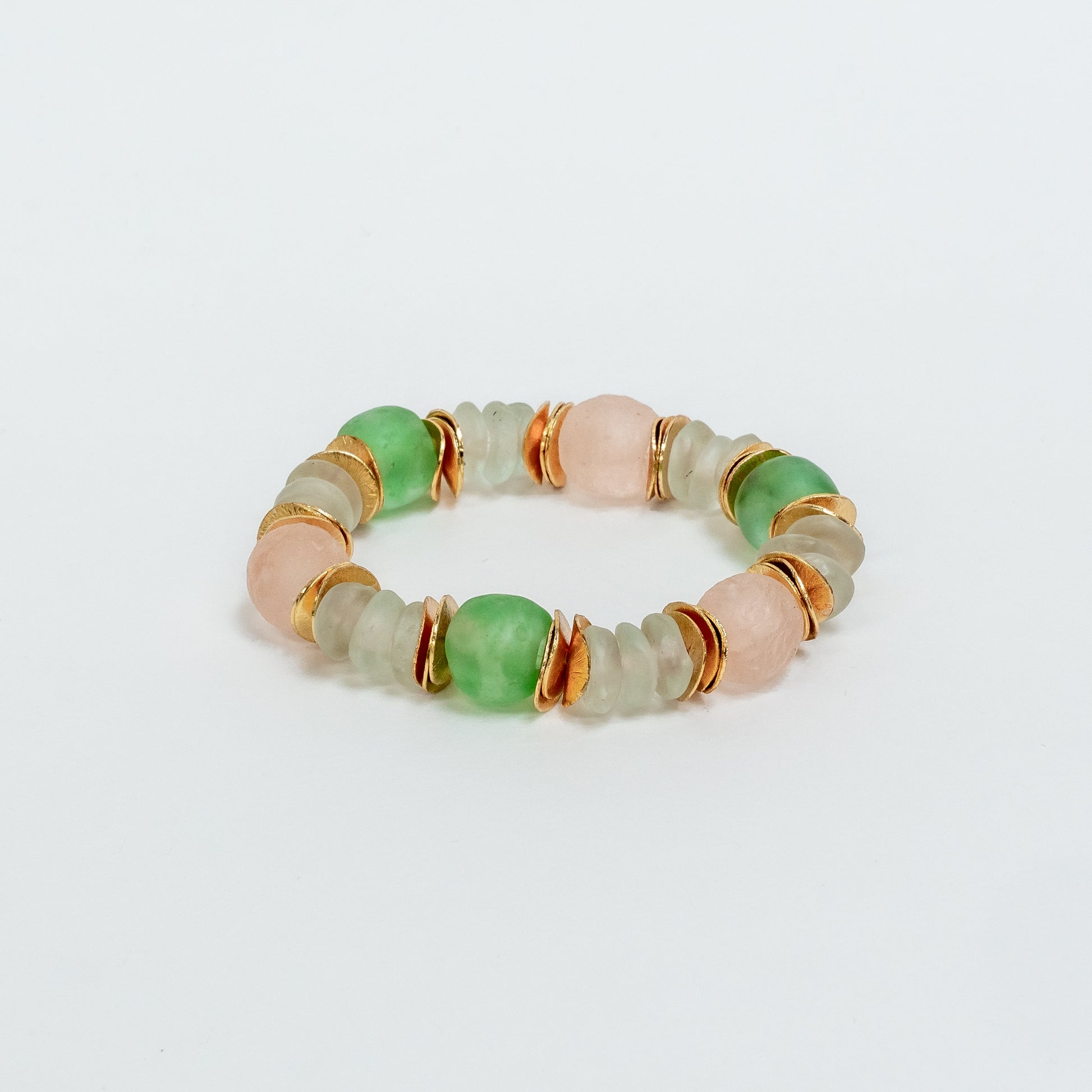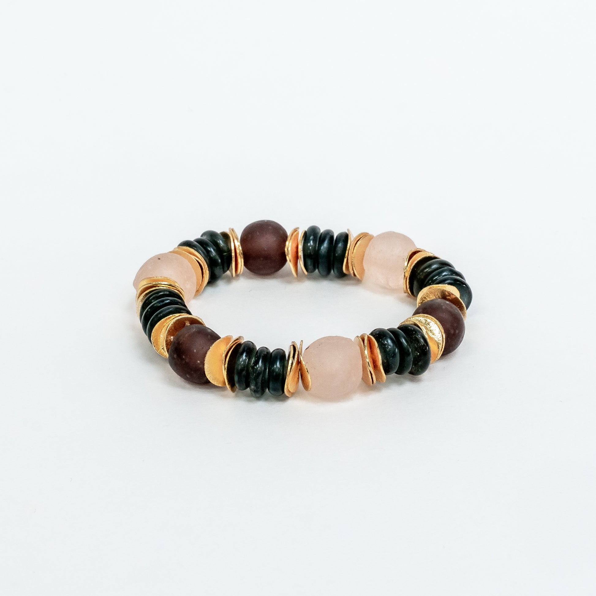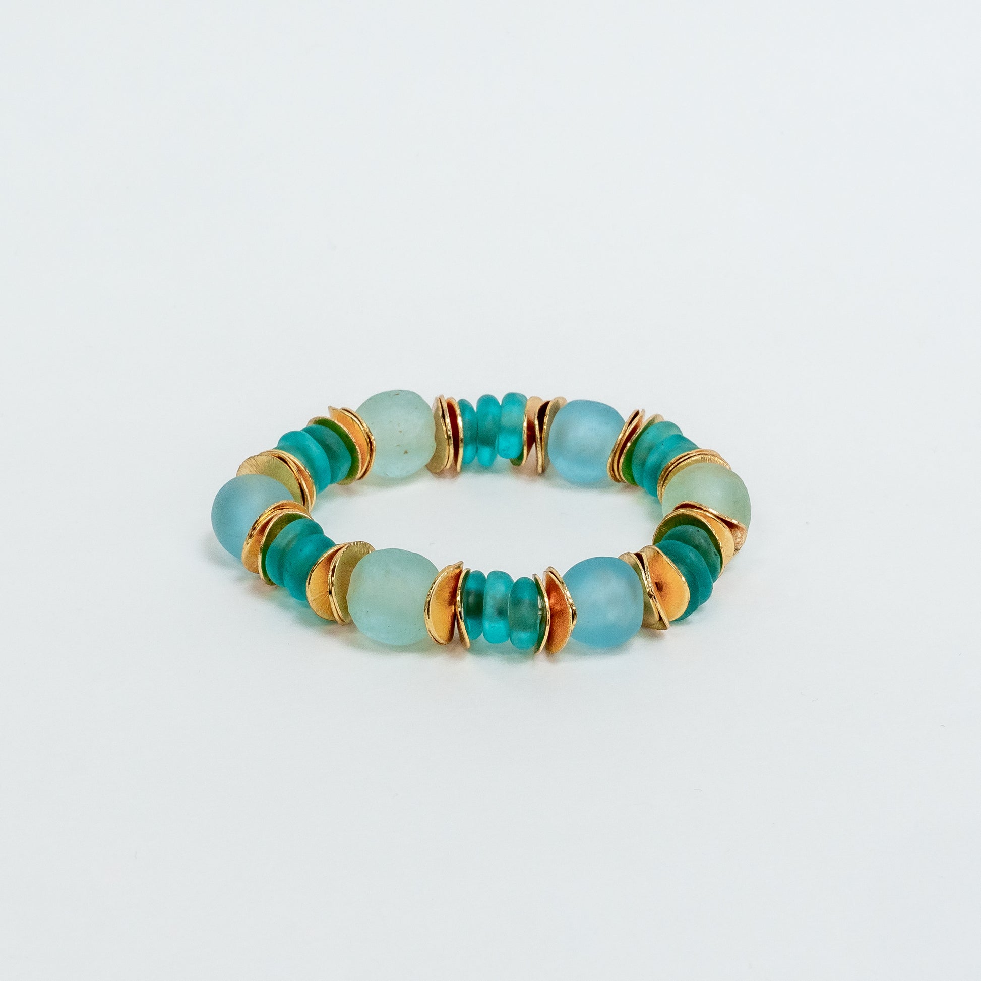 Beautiful imperfect recycled glass beads hand rolled in Africa and wavy 14mm gold discs make up this beautiful bracelet. Glass beads in the colors of the coastal sunset! Stack them together with our gorgeous Seascape Collection, Capri Sunset, or thee Gold Horn Bracelet.