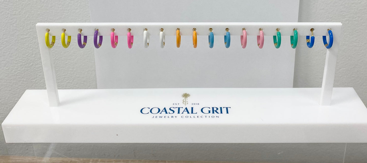 Our Kokomo Earring is sweet and colorful! The perfect earring for our Coastal Kids. Available in 10 colors: Black, White, Lt. pink, Hot Pink, Yellow, Turquoise, Lt. Blue, Blue, Orange, Purple