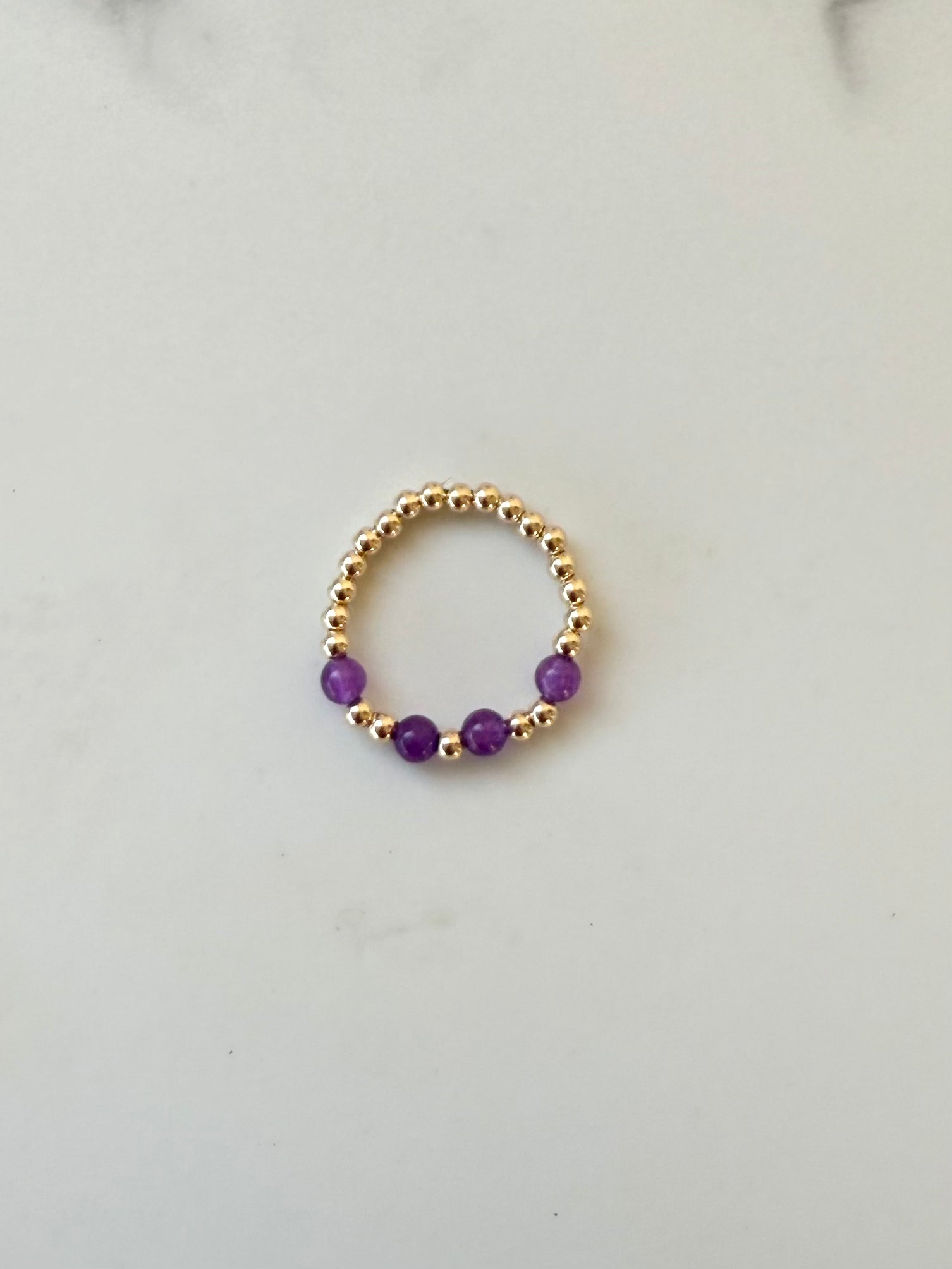 The Luna Ring is designed with 2.5mm gold-filled beads and four purple sunset beads. Stacks beautifully with any of the Gold Coast Ring Collection or perfectly worn by itself for a minimalist look. Sizes 4-8