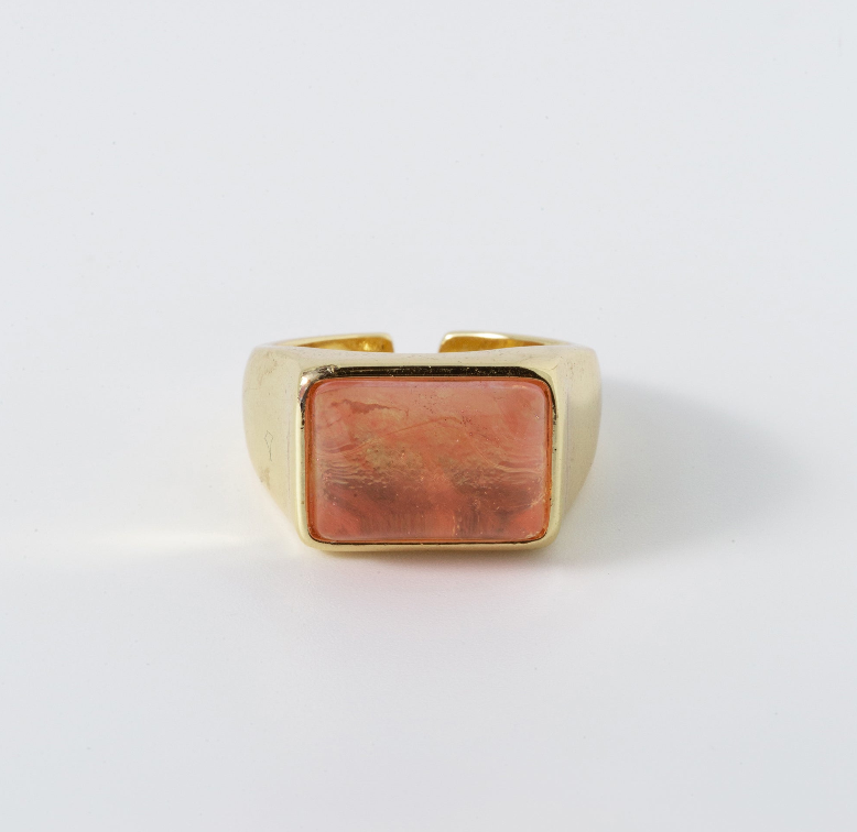Peach colored gemstone in a gold filled setting featuring an open design. *fits most US sizes 6-7 *18k Gold Plated