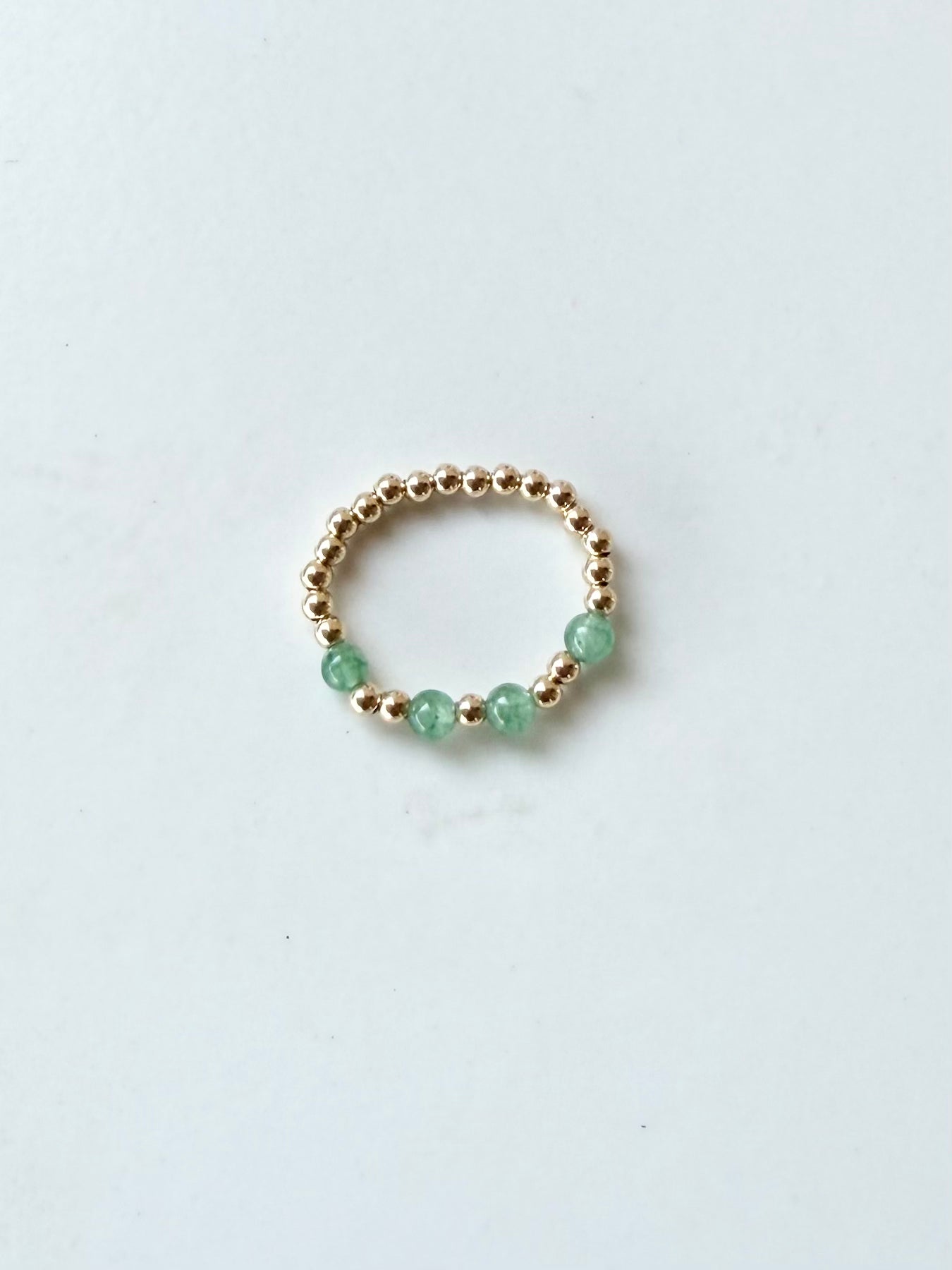 The Marina Ring is designed with 2.5mm gold-filled beads and four green aqua beads. Stacks beautifully with any of the Gold Coast Ring Collection or perfectly worn by itself for a minimalist look. Sizes 4-8