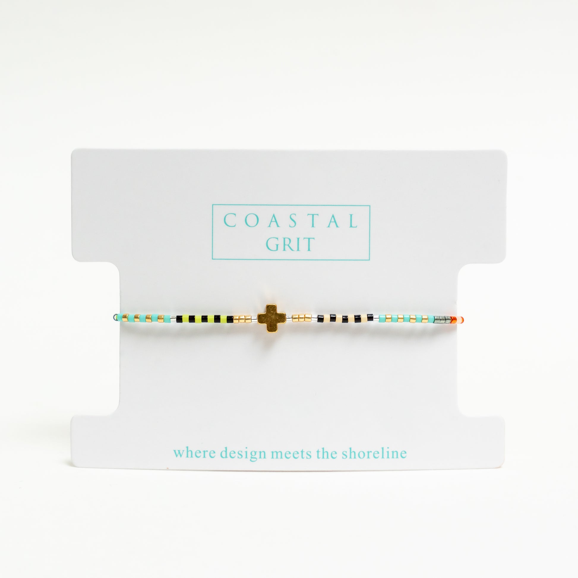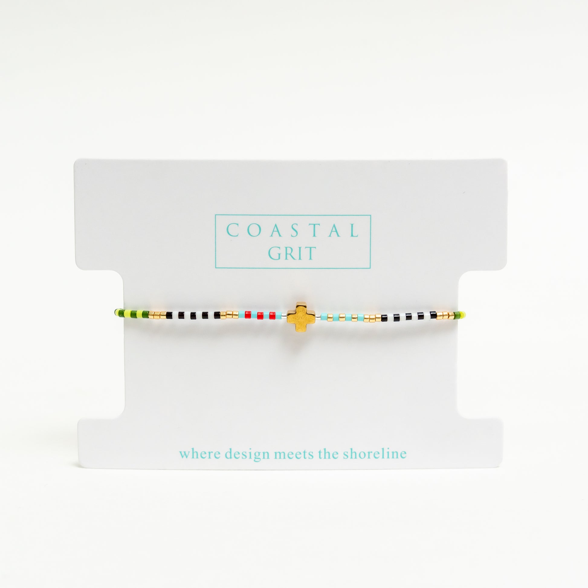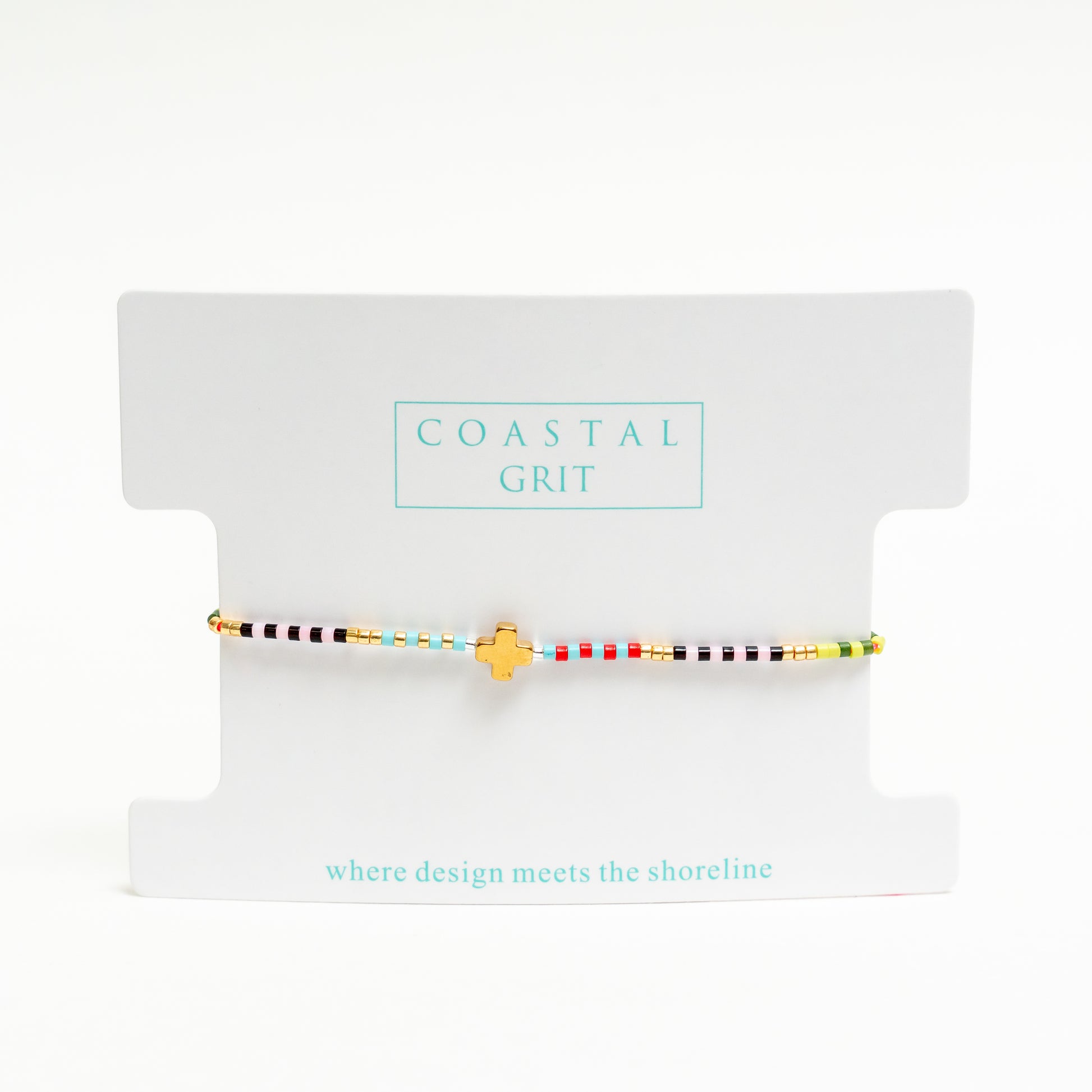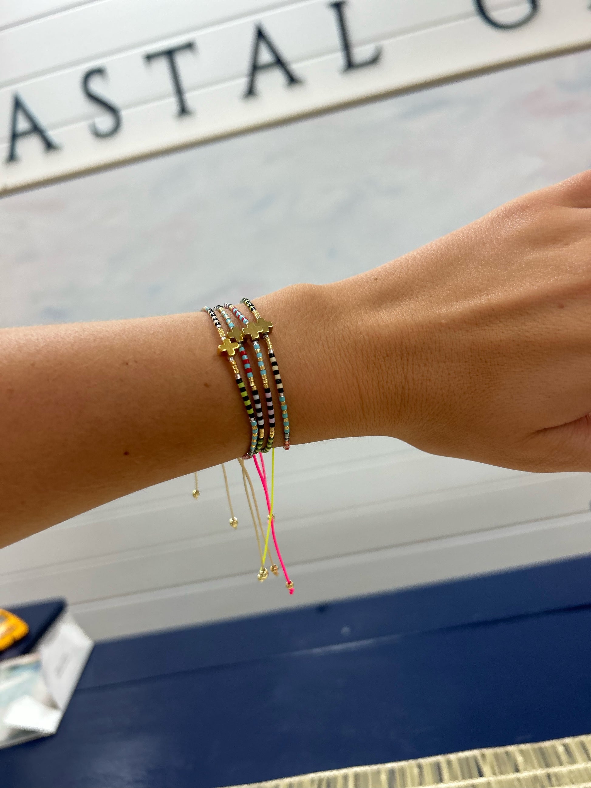 These dainty cross bracelets are made of colorful miyuki seed beads and a gold cross. . The Coastal Cross bracelet is a perfect bracelet to layer with our gold beaded bracelets. Comes in 3 different rope color choices
