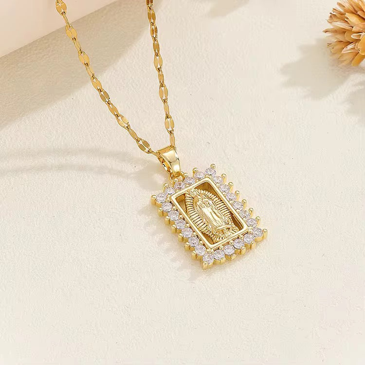 Introducing Mother Earth, the perfect fusion of elegance and spirituality. Crafted in shimmering 18k gold plating, its distinctive rectangle design is adorned with delicate, sparkling CZ stones. Complete with an adjustable length to 20" and featuring Virgin Mary, embrace the divine with this exquisite piece.