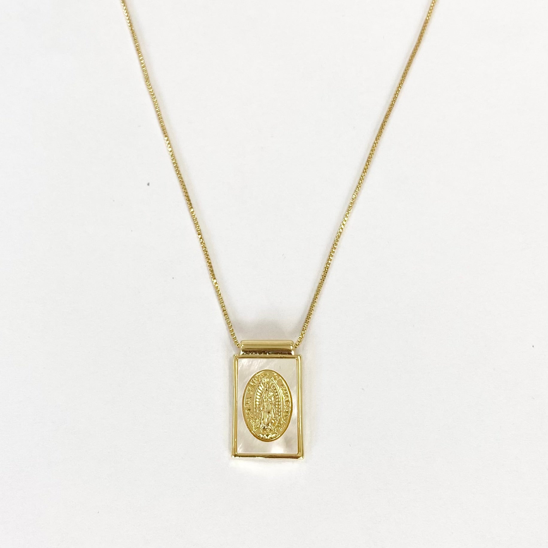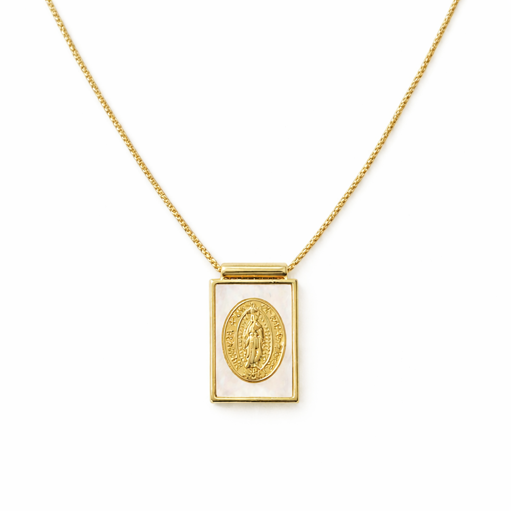 Mother Glory necklace, featuring an 18k gold plated chain and an adjustable length, this necklace showcases a stunning square pearl shell pendant engraved with Mother Mary. A unique and elegant addition to any outfit.