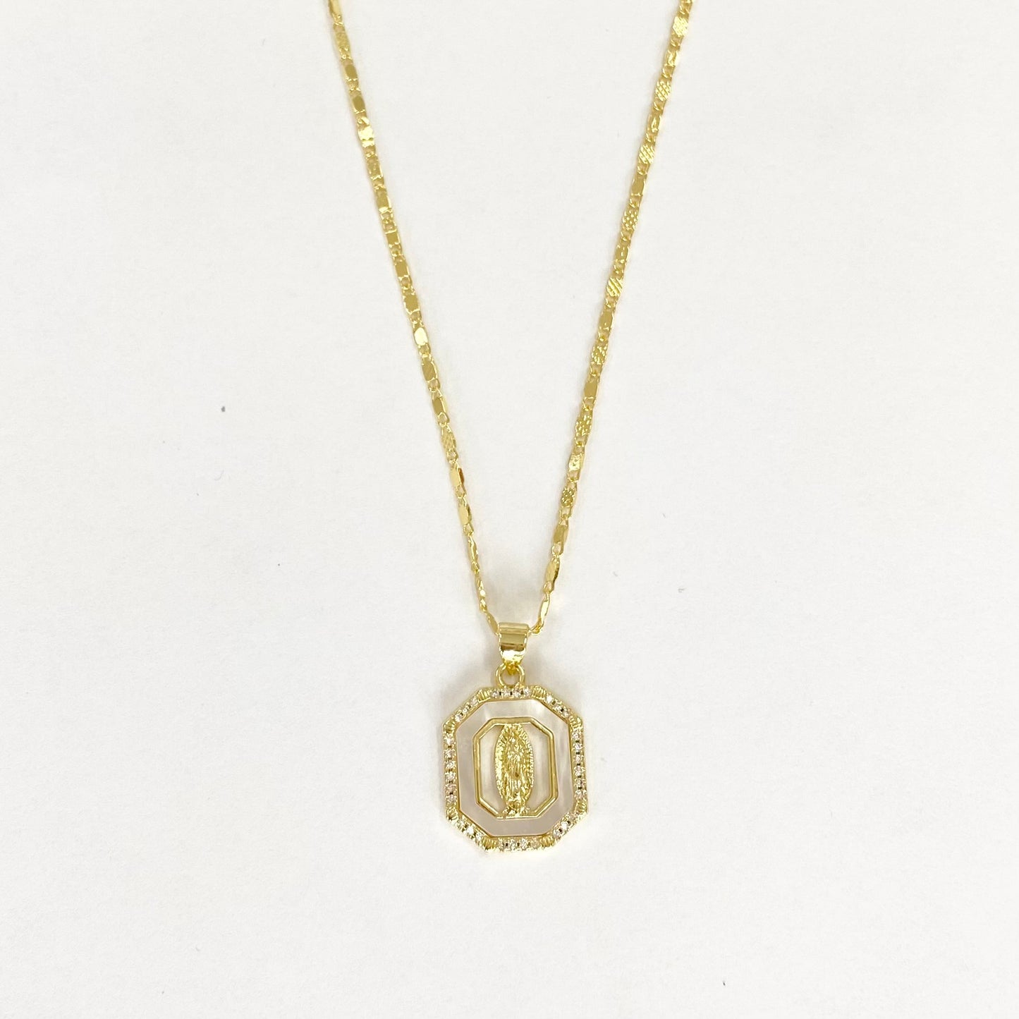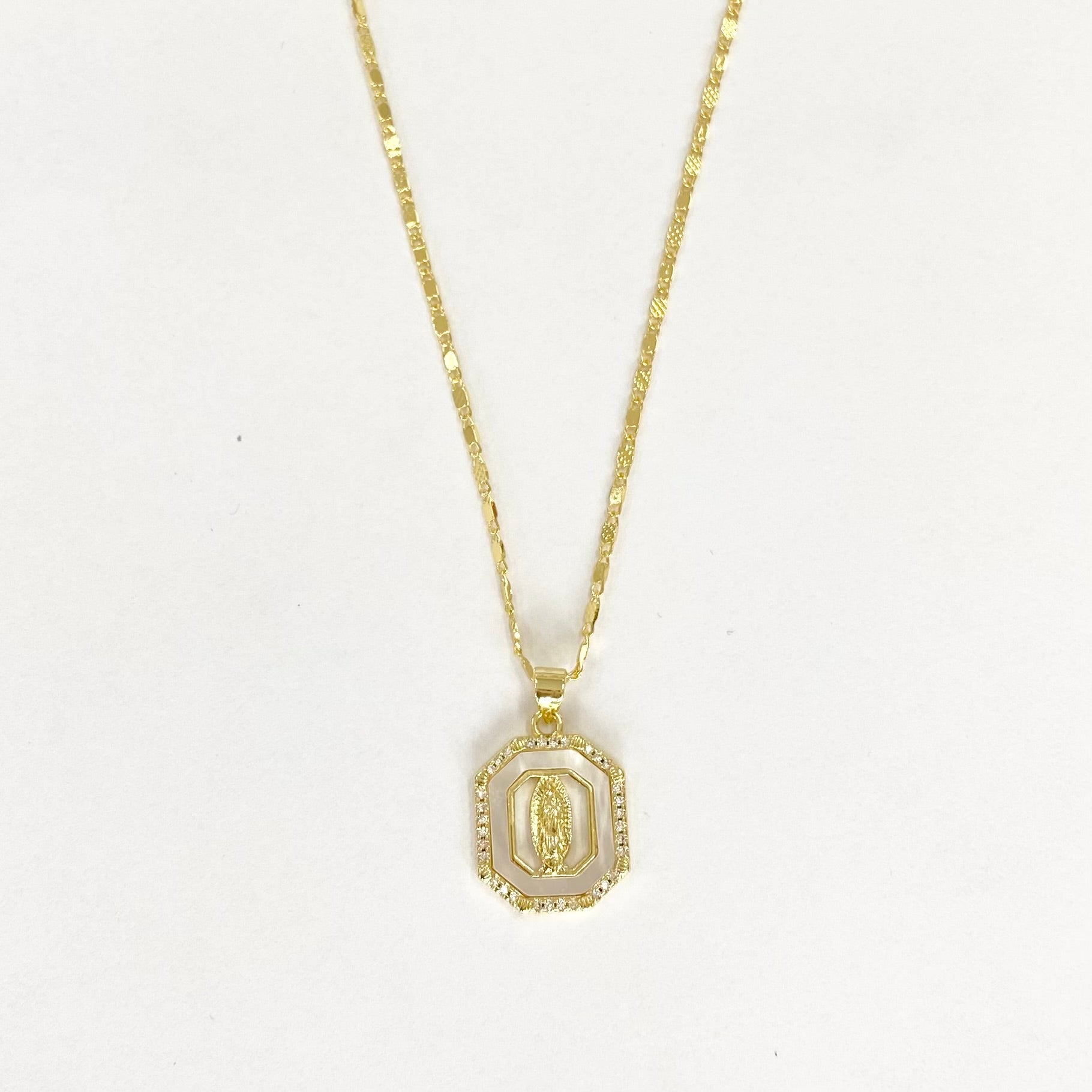 Mother Intention is a stunning necklace featuring 18k gold plated and a pearl shell pendant, adorned with the figure of Mary. With its unique shape and 17.5" length, it is the perfect accessory for any outfit. Elevate your style and pay homage with this exquisite piece.
