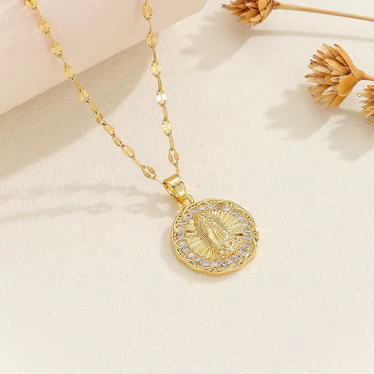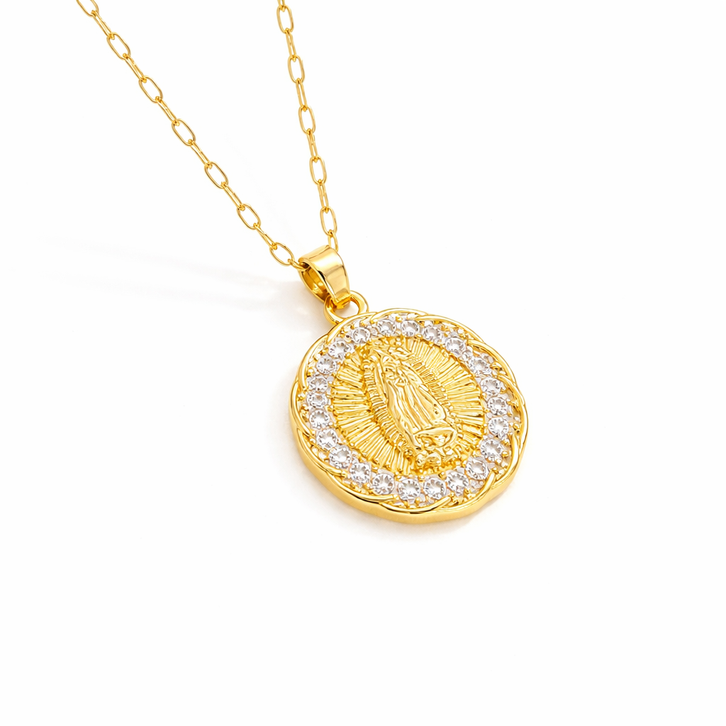 Introducing Mother Wind, the perfect fusion of elegance and spirituality. Crafted in shimmering 18k gold plating, its distinctive design is adorned with a delicate, sparkling CZ stones. Complete with an adjustable length up to 20" and featuring Virgin Mary, embrace the divine with this exquisite piece.