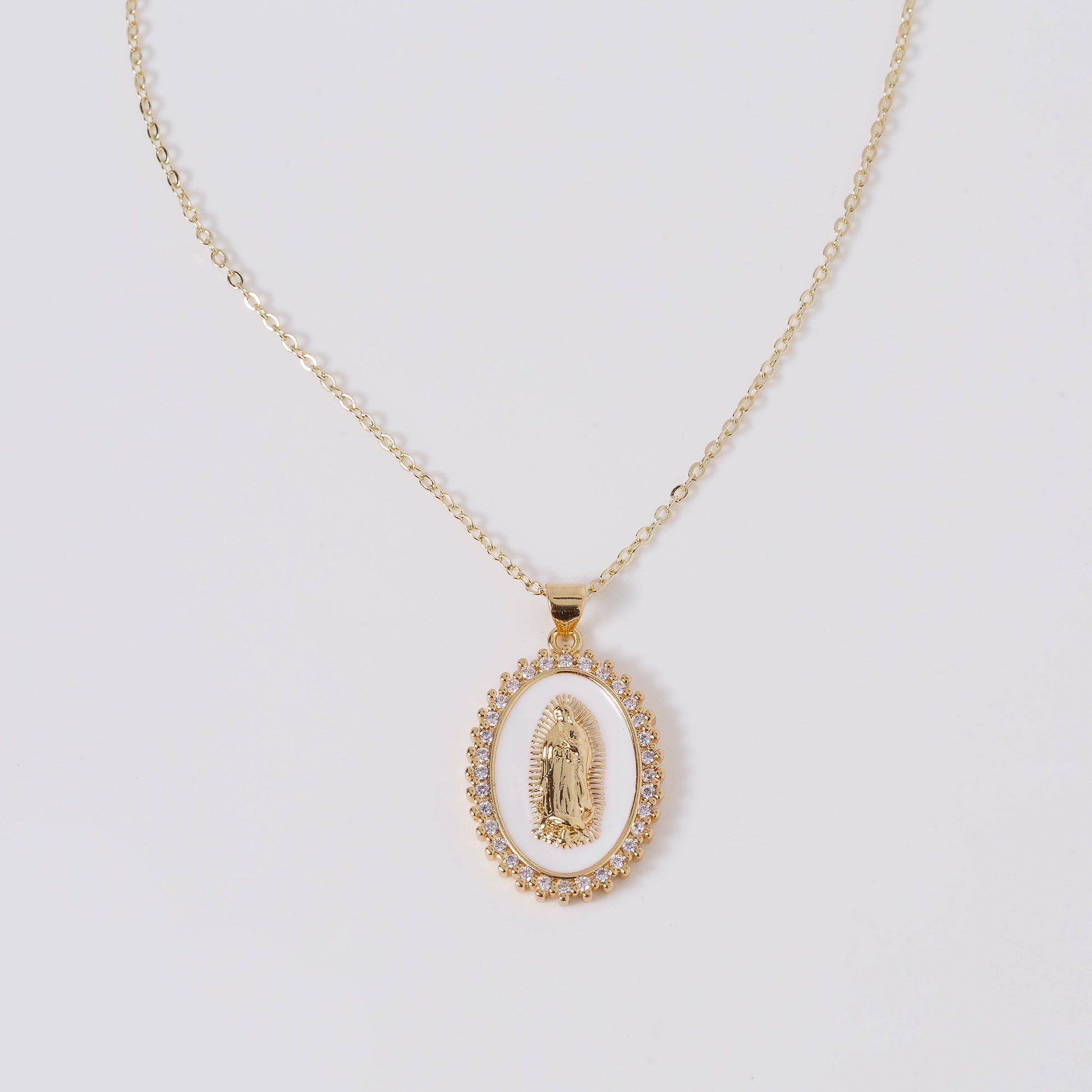 This beautiful white enamel pendant surrounded by CZ stones featuring an image of Our Lady is a wonderful way to show your faith. This pendant hangs from a 18k Gold Plated chain measuring 18" in length. Wear it alone or along with any of our Coastal Grace jewelry.