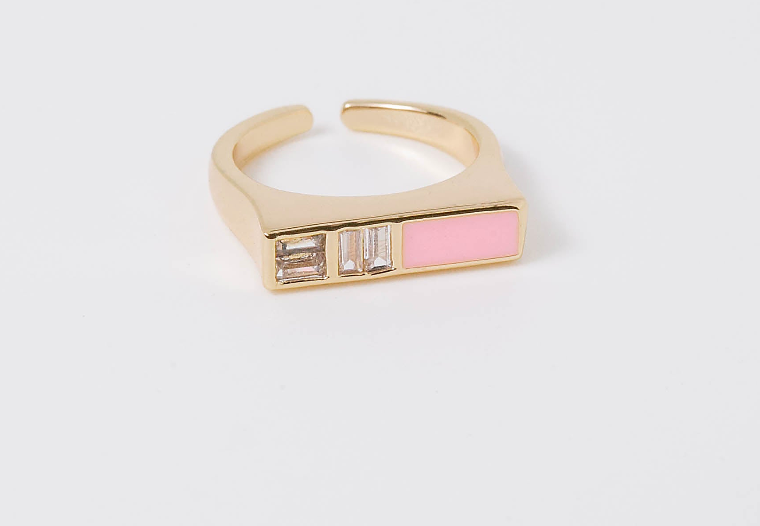 A gold band featuring two large CZ stones and white or blush enamel, sure to give color pop to any outfit. *Open Design - fits most US sizes 5-7 *Tarnish Free, 18k Gold Plated