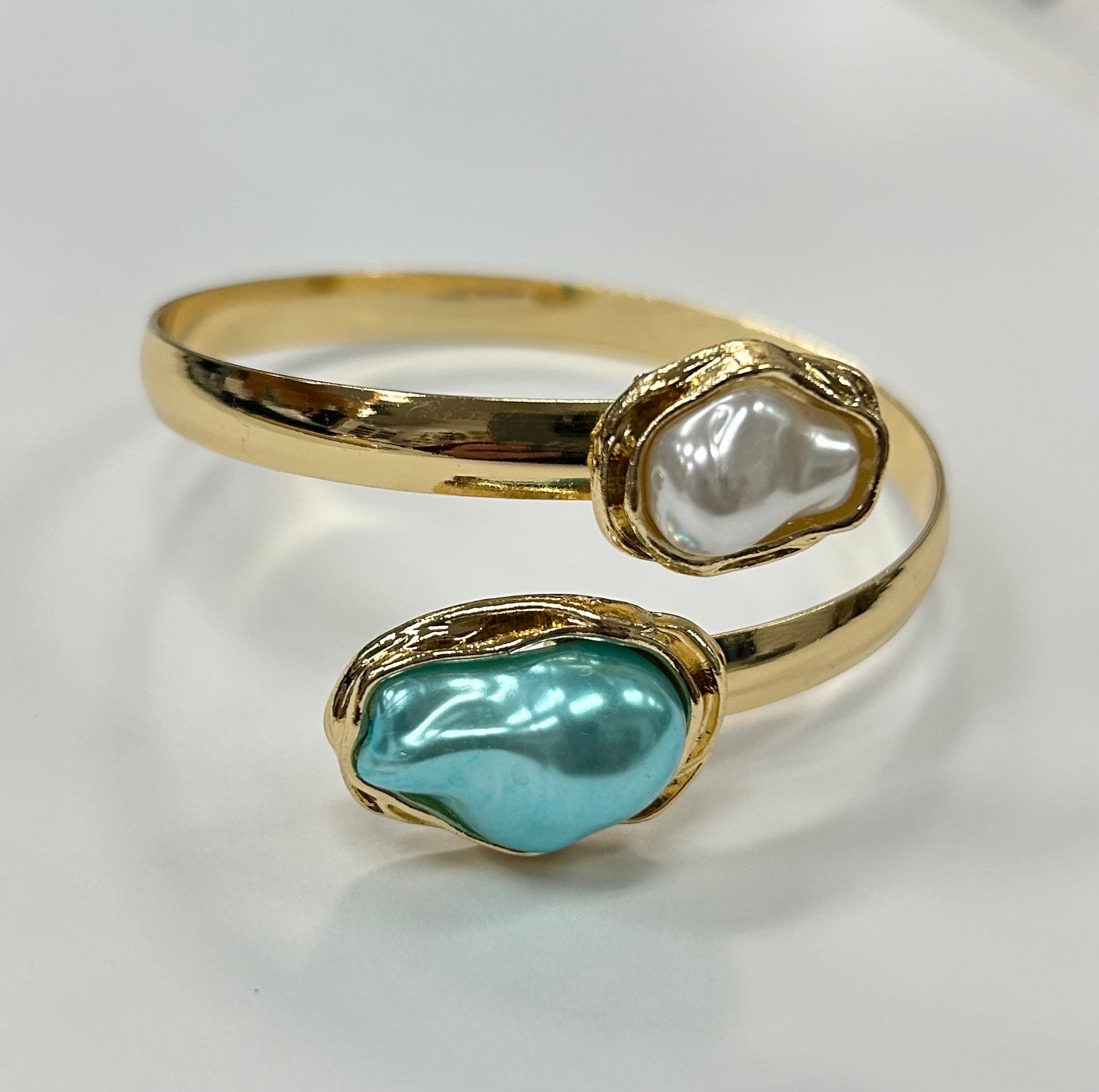 Slip on coastal charm with this whimsical bangle featuring two oyster shell ends—one in a soft pearl finish and one in a vibrant hue that catches the light. Perfect for layering or wearing solo, this playful piece brings a touch of beachy elegance to any wrist. A conversation starter that celebrates the beauty of the sea. Pair with the matching Serenity Shell Ring!