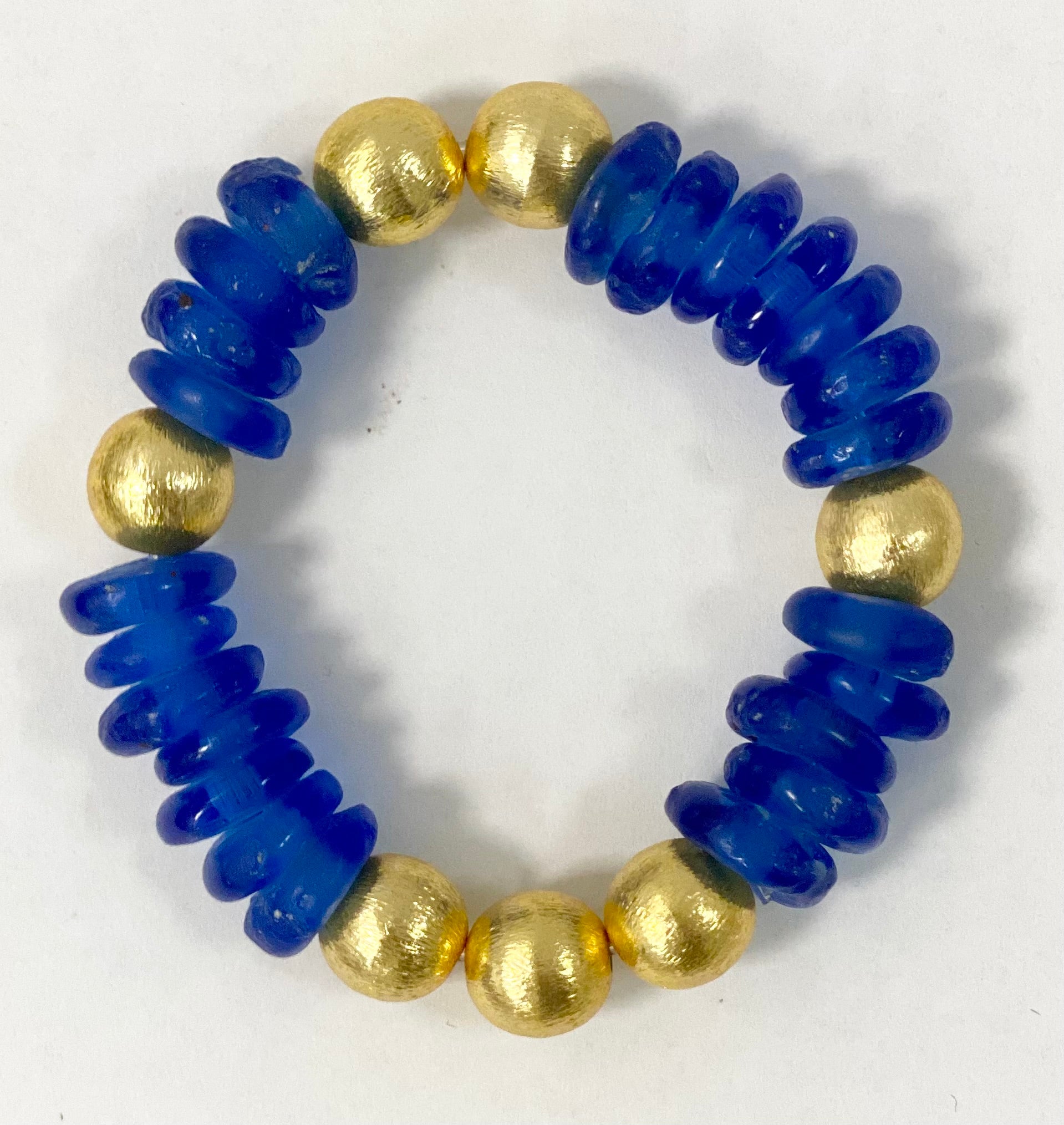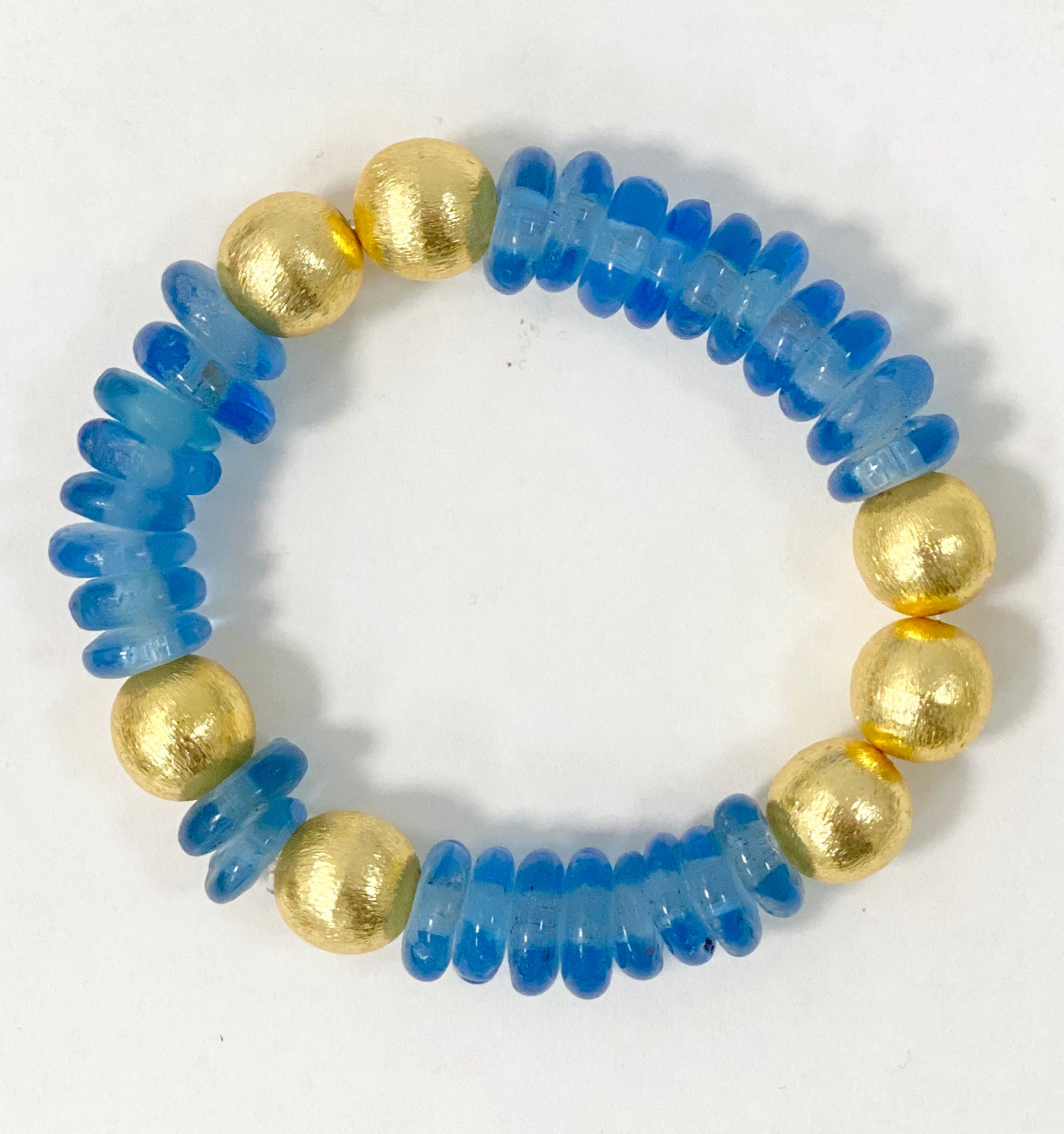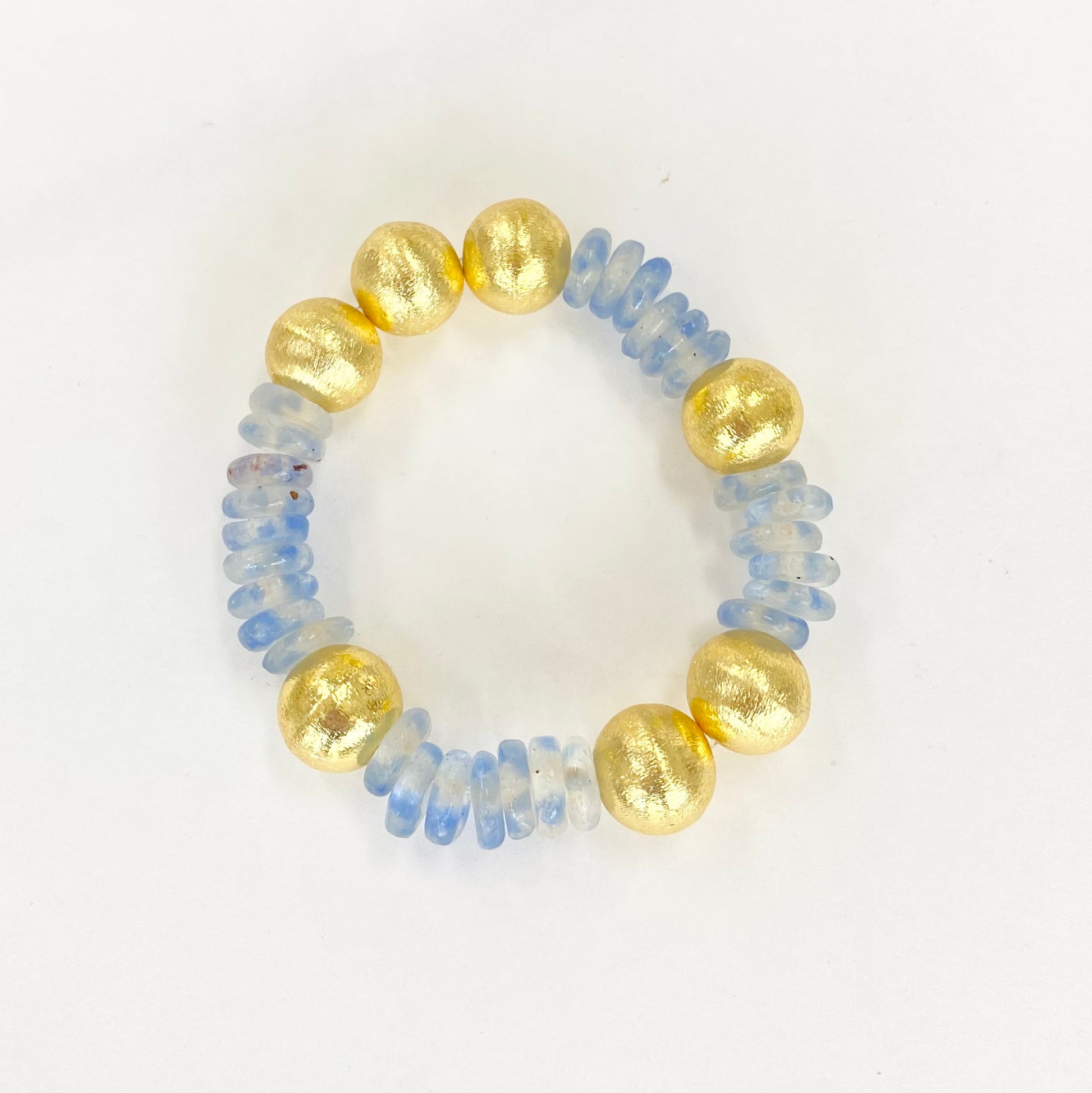 Look up and be mesmerized by the Sierra Sky Bracelet. Made with recycled glass beads and a brushed gold balls, this bracelet channels the beauty of the open sky. Its unique design will add a touch of whimsy to any outfit.