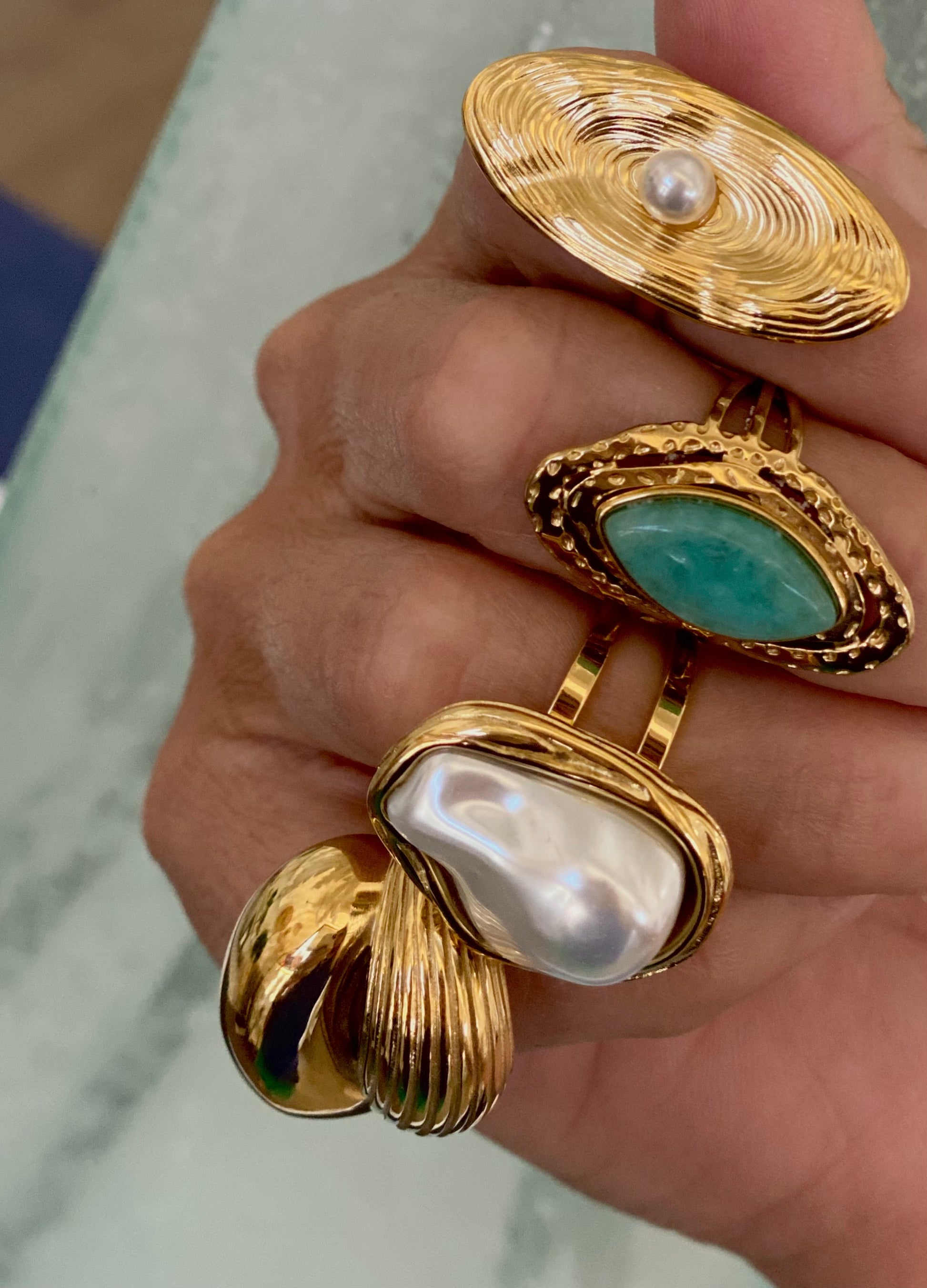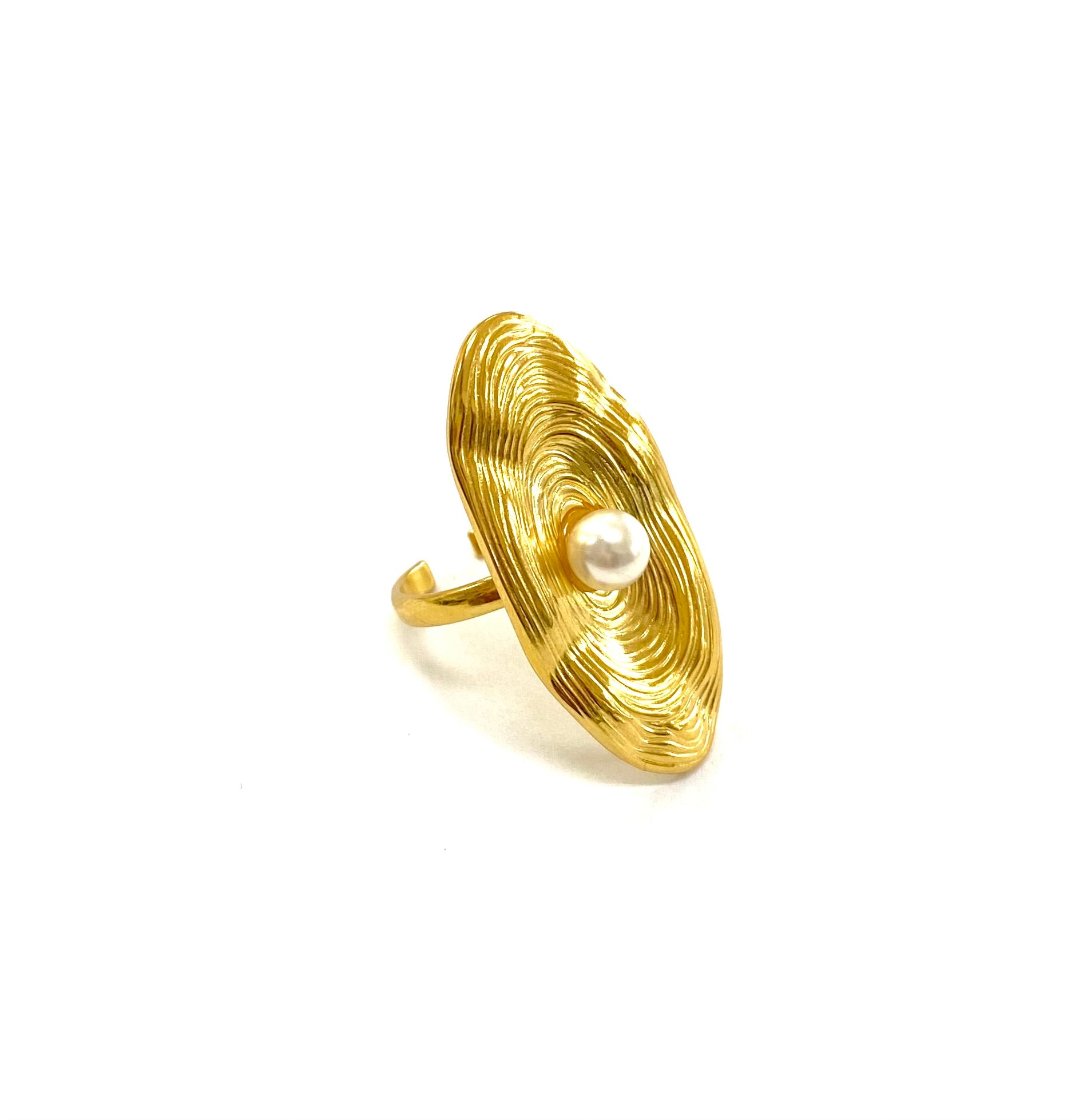 There's nothing more we love than a chunky ring. Our Silo Ring has a textured feature adding dimension with a center pearl. Waterproof and tarnish-free, this piece will take you from daytime glam to an elegant dinner look. Sizing adjustable