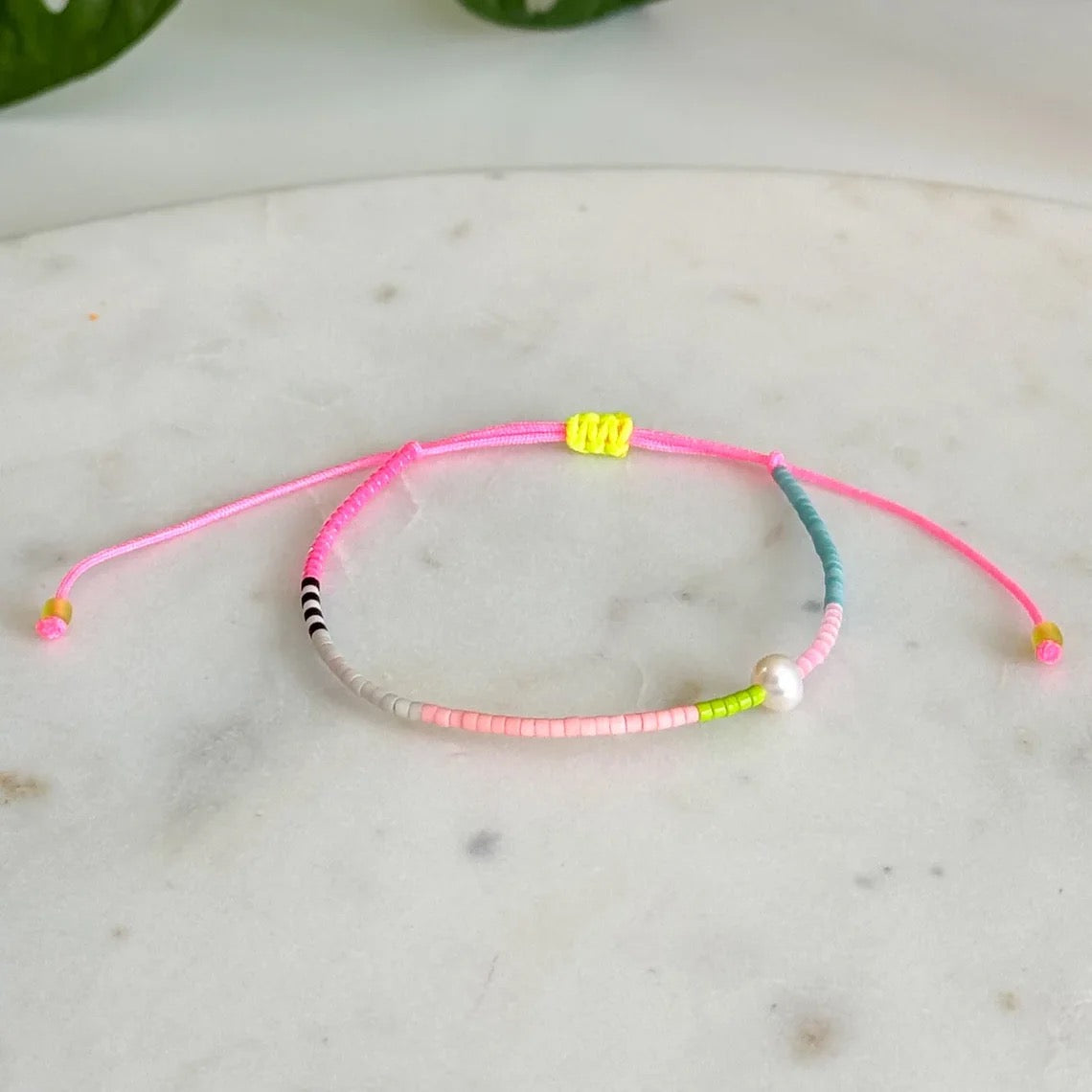 Fun, colorful patterns accented with a freshwater pearl make the perfect summer bracelet. Adjustable string bracelet fits sizes 5.9" to 10"