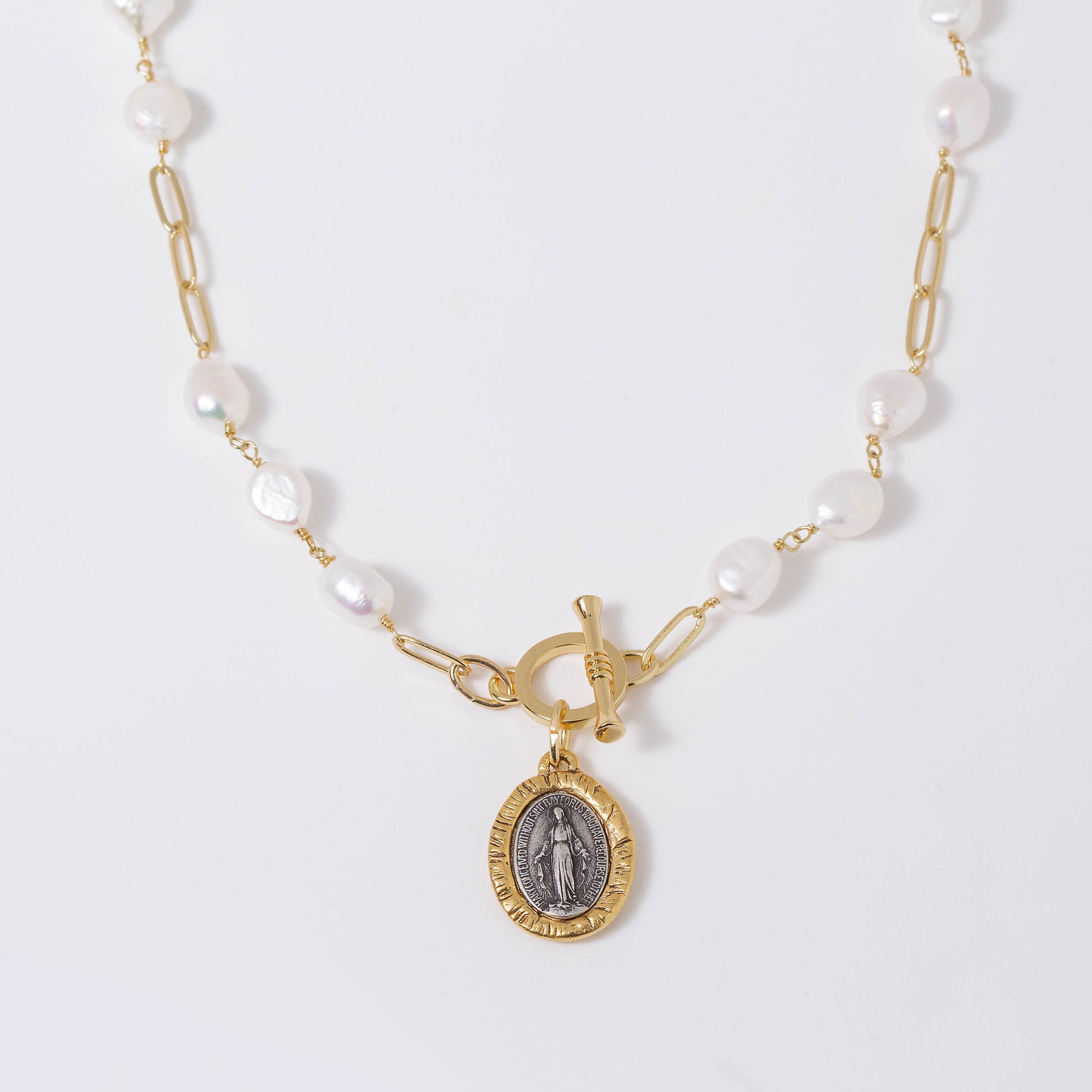 A beautiful two-toned pendant, antique bronze and gold with an embellishment of Mother Mary. This gorgeous pendant is available on three different style chains - 17.75" gold filled straight bar chain, 20" chunky chain featuring a toggle clasp, and a 20" Baroque Pearl necklace featuring a toggle clasp.